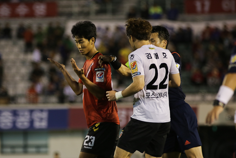 후반전 신경전이 계속되는 경남fc 와 포항