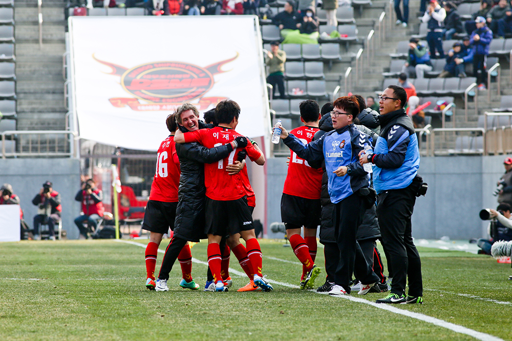 루크가 결승골을 터뜨린 후 벤치로 달려가 환호하는 선수들과 발터코치