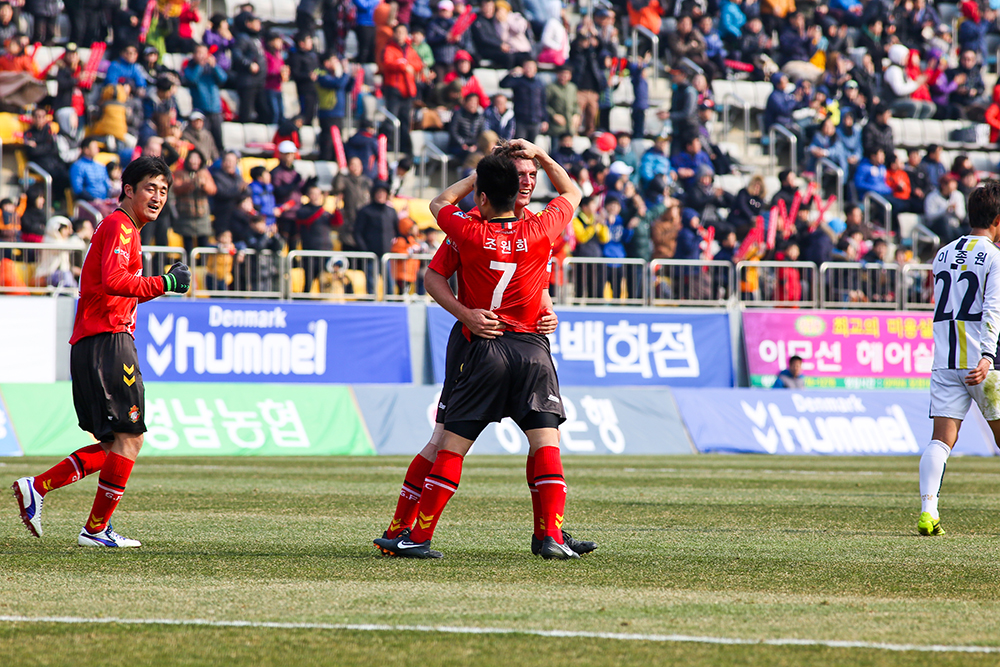 루크가 골을 터뜨린 뒤에 조원희와 끌어안고 환호하고 있다.