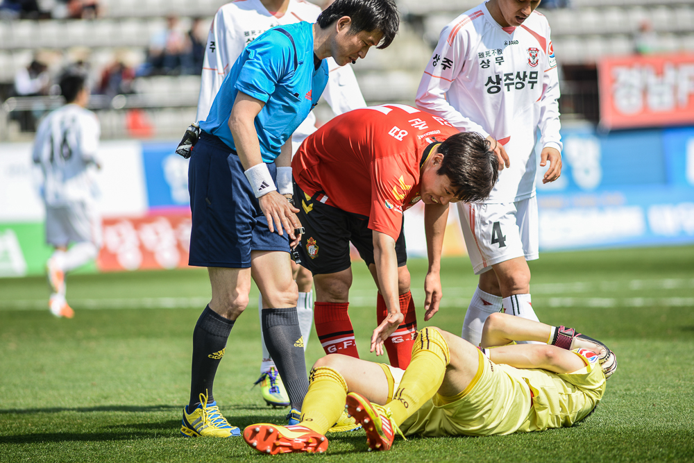 상주측 콜키퍼와 크게 부딪힌 후 골키퍼를 걱정하는 김준엽선수